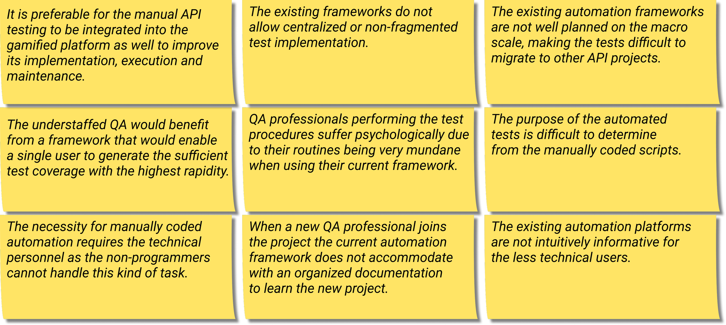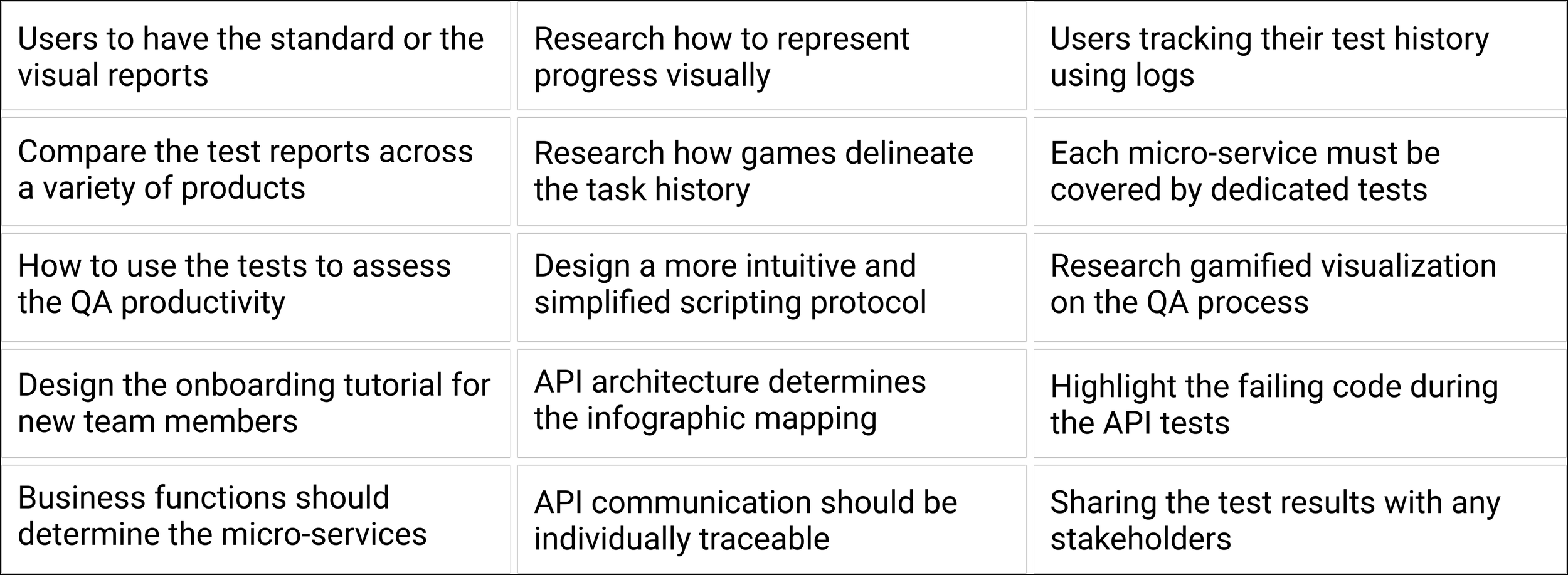 Pain points - hindrances of various categories in the whole software testing process experienced by the QA department. The primary pain points compiled here prioritize the areas of interaction with the test framework that have been identified as the most impairing the QA team productivity.